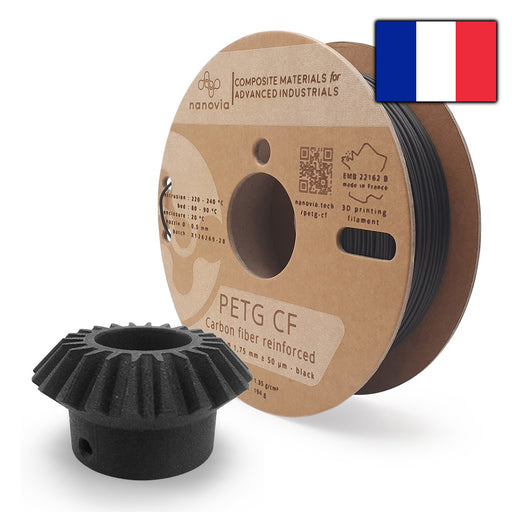 Afficher tous les détailsFilament PETG Chargé Carbone du fabricant français nanovia en diamètre 1,75 mm / 500g. Cet alliage de PETG et de fibre de carbone a été spécialemen...