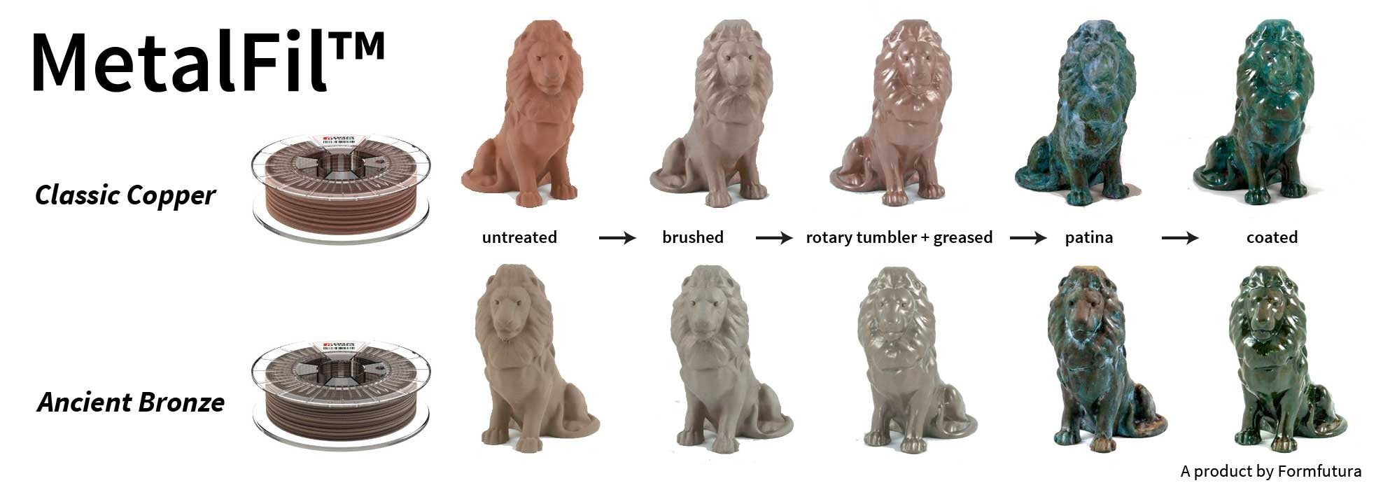 FormFutura nous présente ici un filament de la gamme MetalFil, un filament composé de 80% de bronze associé à une base PLA de coloris "ancient bronze". Les objets imprimés auront un rendu bronze sans pareil, ils seront aussi plus lourds que des objets en ABS ou en PLA.